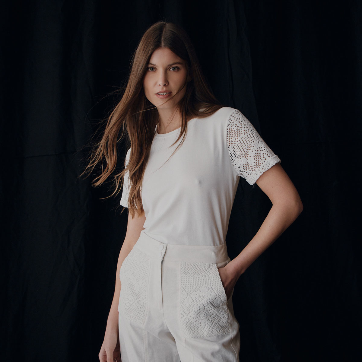 Pantalón palazzo tiro alto, con detalle de cintura, recortes laterales y botamanga a contratono, cierre delantero con ganchos pantaloneros con aberturas laterales.