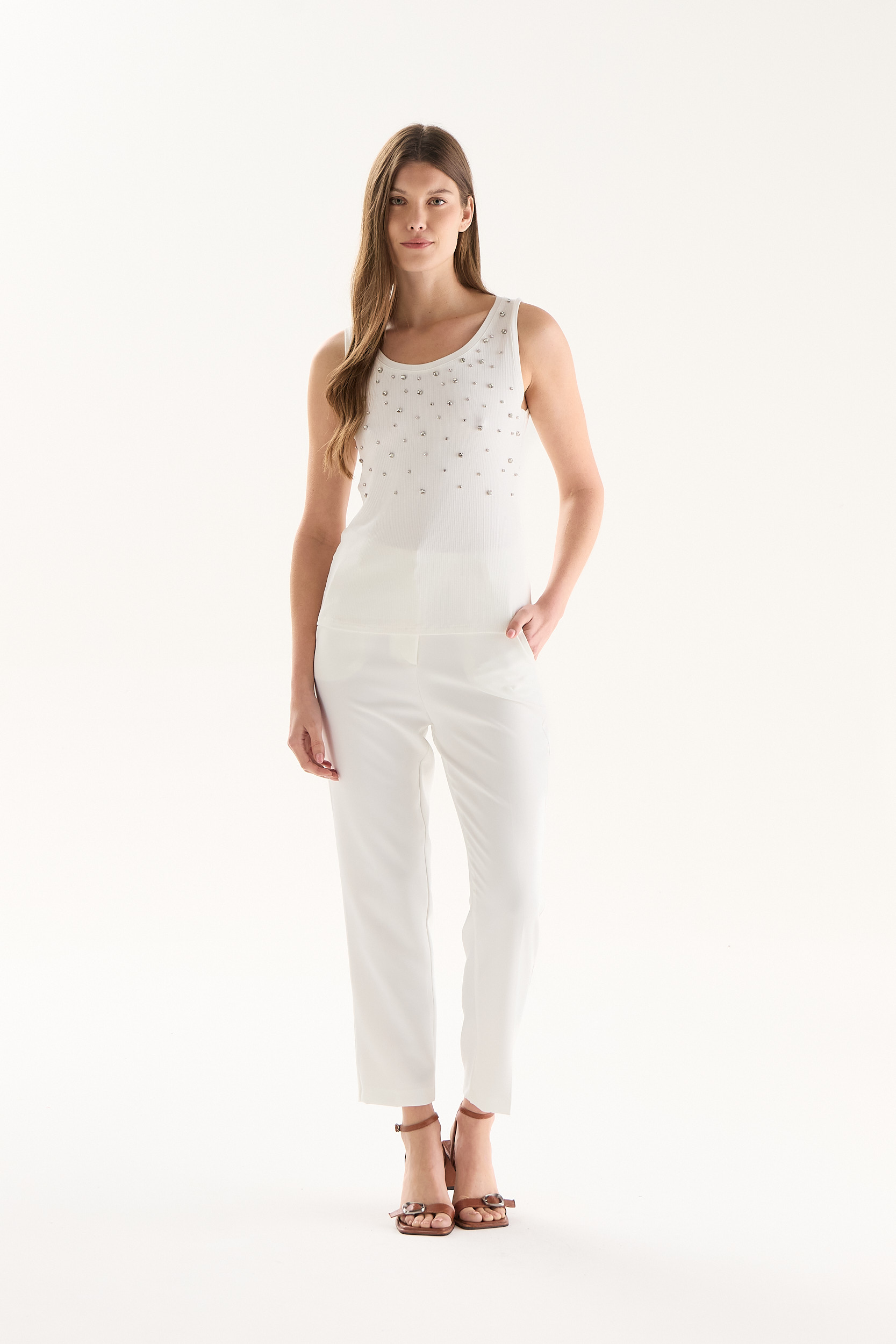 Musculosa de fit entallado con breteles angostos y escote en U. Confeccionada en tela morley, un tejido elástico y cómodo que se adapta al cuerpo. Presenta piedras bordadas en el frente que aportan un detalle sutil.